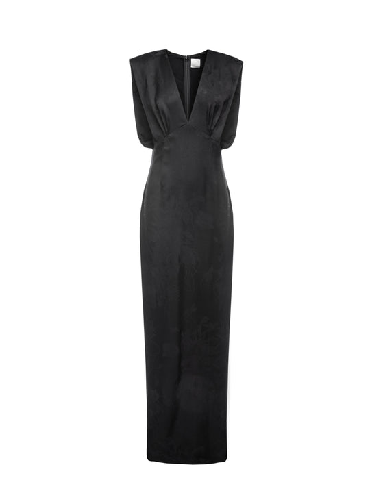 The Zinnia gown is cut from viscose jacquard with a tonal floral motif. The Zinnia has padded shoulders, a narrow V-neckline and a bias-cut skirt with a self-tie bow at the back.